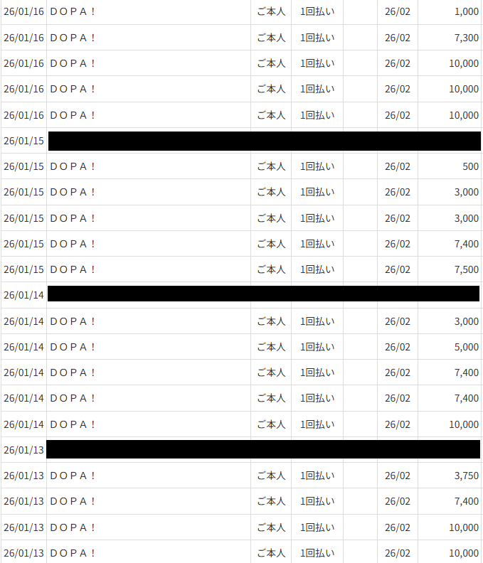 こちらが実際に『DOPA!』でポイントを購入している履歴の一部です。